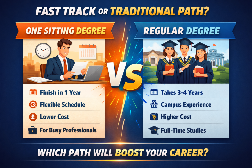 Today, learners are exploring alternatives like single sitting degree, one sitting degree, and one year degree courses to fast-track their education. At the same time, regular degrees continue to offer depth, structure, and long-term academic value.